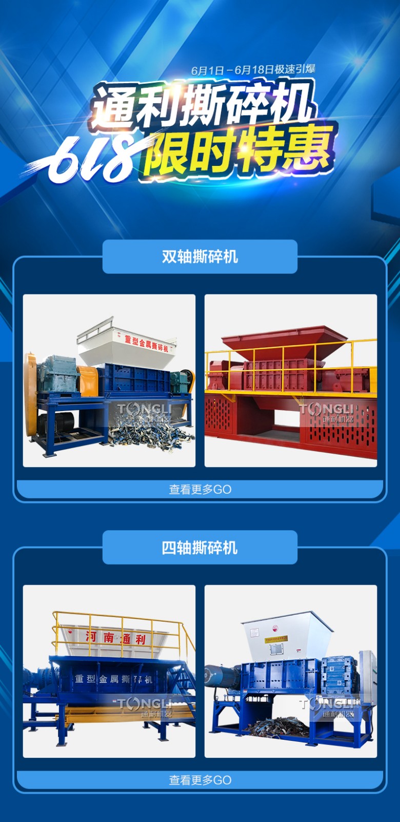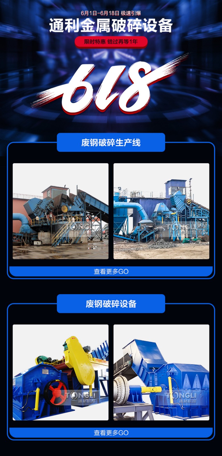 一年一度的6.18馬上要來(lái)臨了,各個(gè)廠家,網(wǎng)購(gòu)app,實(shí)體店等等都紛紛為了這次活動(dòng)卯足了勁兒,這不,趁著此次活動(dòng),河南通利廠家也來(lái)搞個(gè)促銷(xiāo),廠區(qū)現(xiàn)有的中小型金屬破碎機(jī),單機(jī),整套購(gòu)買(mǎi)均有不同折扣的惠活動(dòng),款款現(xiàn)貨等您來(lái)。
