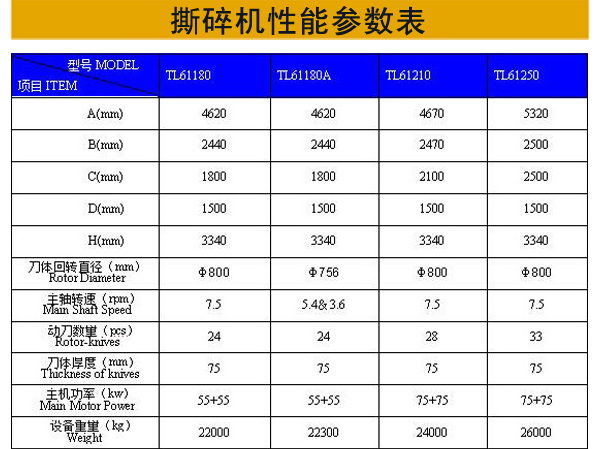 說明:  1.動(dòng)刀標(biāo)準(zhǔn)厚度為75mm,也有50、100mm,可根據(jù)物體破碎后顆粒小來刀體。   2.動(dòng)刀為單爪刀體,如需雙爪刀體及多爪刀體的用戶可與業(yè)務(wù)部聯(lián)系。   3.TL61180A是在TL61180基礎(chǔ)上作的改進(jìn),減速機(jī)機(jī)座號(hào)改,轉(zhuǎn)速降低,扭矩增。